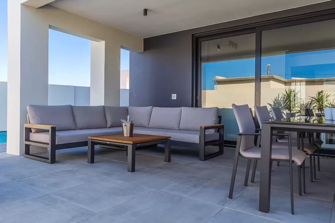There's a living room with a dining area, a TV corner with a smart TV, modern sofas, a luxury kitchen with high-end appliances, and a utility room with a washer and dryer. Every bedroom has a king-size bed, a smart TV, a private bathroom, and a closet. Sliding doors lead from both bedrooms on the second floor to the wide covered balcony. At Tuscany residences they build to the greatest building standards and produce the top-quality residences in Aruba.