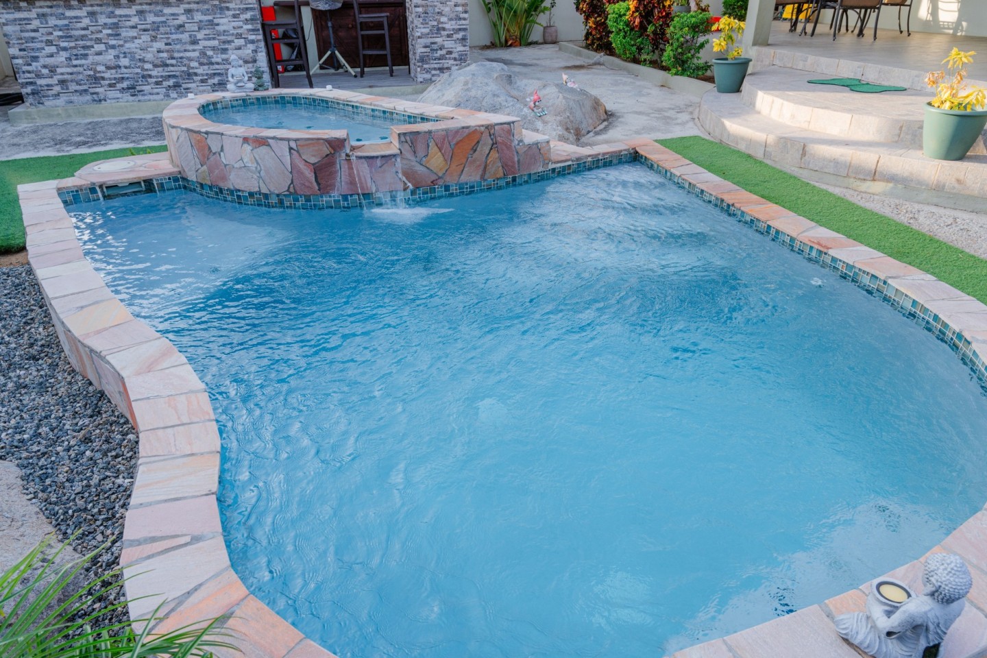 Step outside into your own personal haven. The expansive porch provides plenty of space for outdoor seating and lounging, perfect for al fresco dining or enjoying the tropical breeze. From here, you can access a stunning pool area that features: